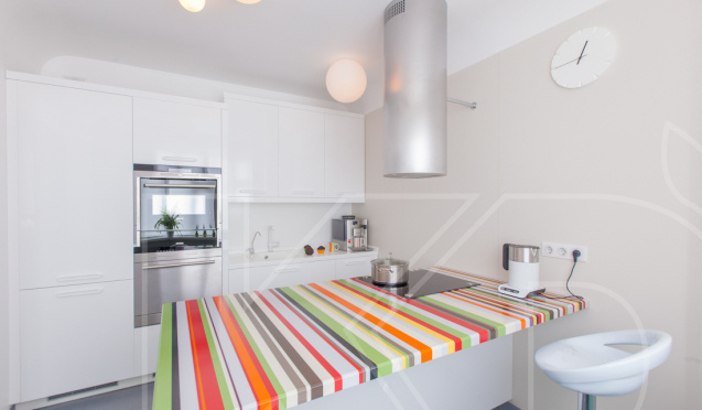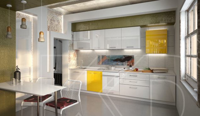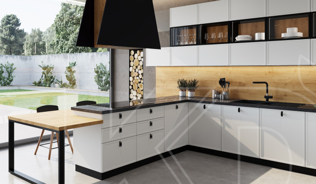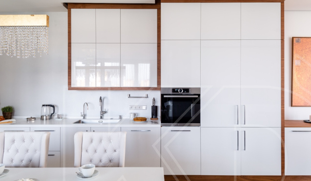 Более доступную стоимость имеют кухни из МДФ, материала, состоящего из древесных волокон, связанных смолой. Подобные модели стали очень популярными в последние годы из-за своей практичности. Белая кухня из МДФ может иметь глянцевые или матовые фасады.
