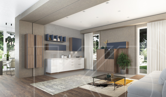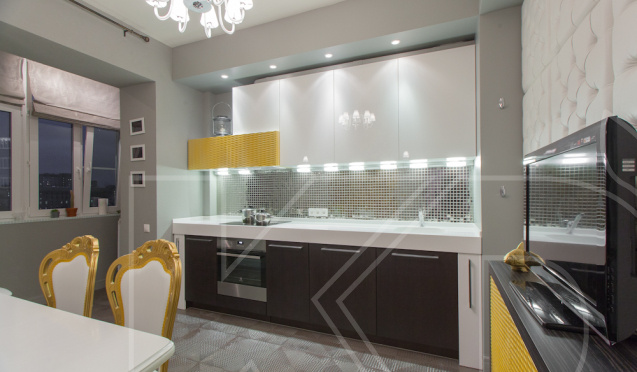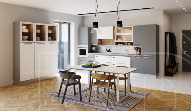 Чтобы комплект гармонично встроился в пространство, учитывайте его планировку и размеры помещения. Так, для небольшой комнаты подойдет линейный гарнитур, модули которого уместятся вдоль одной стены.