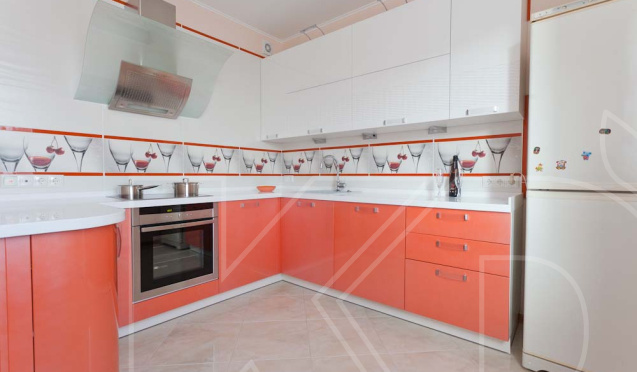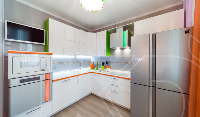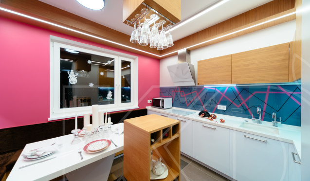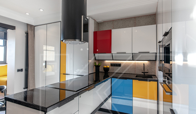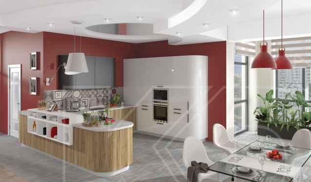 Если вы любите яркие расцветки, комбинируйте белый с красным. Последний можно использовать для оформления столешницы, полок или фартука.