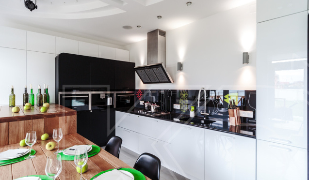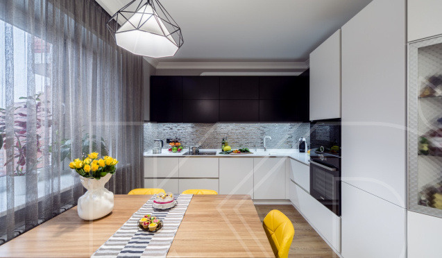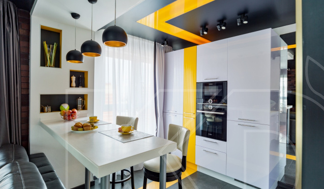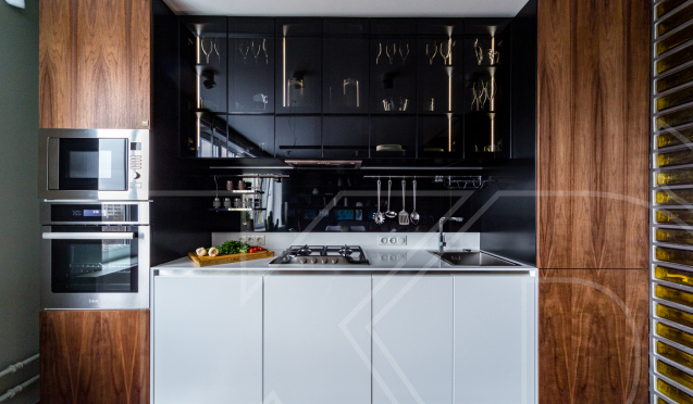Черные элементы способны придать выразительность любому светлому гарнитуру. Поэтому ими часто оформляют кухни белого цвета. Как правило, в черном цвете выполняют полки, столешницы, декоративную отделку.