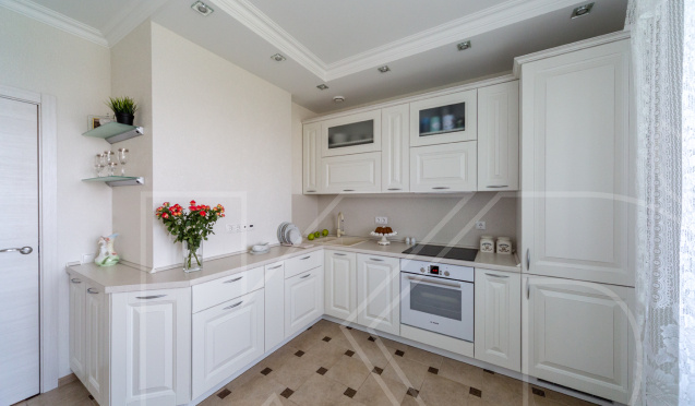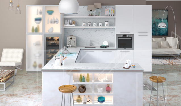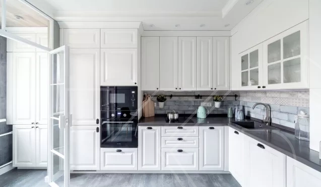 П-образный белый кухонный гарнитур – идеальный вариант для просторных комнат. Модули подобного комплекта размещаются вдоль трех смежных стен.