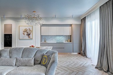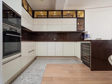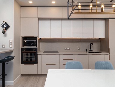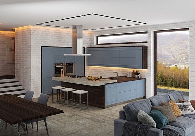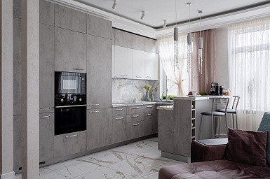 В больших помещениях кухня и гостиная часто оказываются совмещенными. Визуально отделить одну зону от другой можно с помощью островной конструкции, барной стойки или стеллажа. Зонирование с помощью кухни на заказ от производителя технически выполнить гораздо проще. Дело в том, что комплект будет изготовлен с учетом архитектуры пространства.