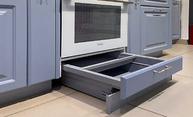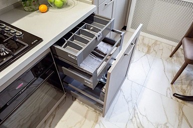 Все кухонные гарнитуры имеют рабочую поверхность, под которой устанавливают места хранения. Специалисты рекомендуют оборудовать нижние модули выдвижными полками, так как они вмещают большое количество предметов и более удобны в использовании. Традиционные ящики лучше оснастить разделителями, что обеспечит комфортное размещение предметов.