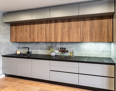 - Линейная. При такой планировке модули расставляют в один ряд возле стены. Это подходящий вариант для небольших комнат, когда важно сохранить каждый сантиметр пространства.