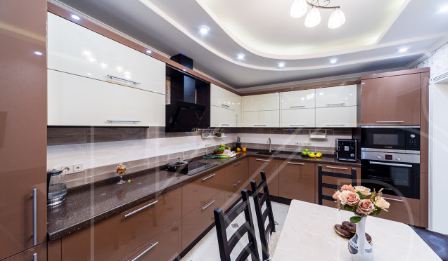Бежевые кухни не уступают по практичности белым оттенкам, несмотря на то, что также относятся к этой гамме. Основное преимущество – практичность и широкий выбор оттенка. Критерием для идеальных бежевых кухонь, особенно в глянцевом стиле, является эргономика пространства. Это отсутствие громоздких шкафов, которые дизайнеры поменяли на компактные полки открытого типа или обустроенные ниши для кухонных принадлежностей.