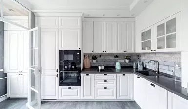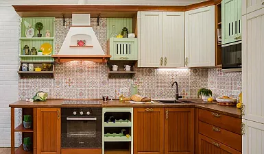 • Более авангардные решения, в которых на фасадах мебельного гарнитура применяются вставки из натурального дерева или белые блоки – смотрятся более свежо в любой обстановке вне зависимости от степени освещенности. Они понравятся почитателям стилей прованс, эклектика и модерн.