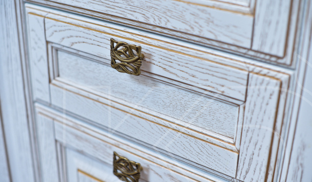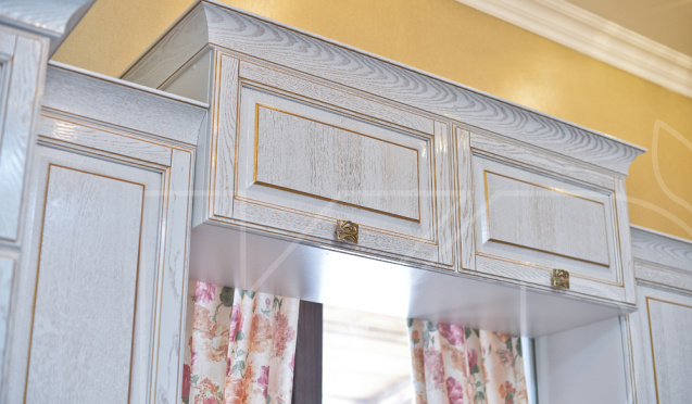 В просторную комнату можно встроить комплект с золочеными фасадами. При этом глухие дверцы можно разбавить стеклянными. Благодаря этому приему можно сохранить воздушность и свет в помещении.