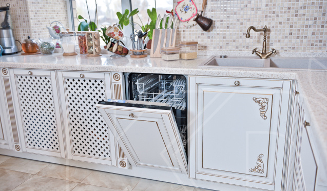 Нельзя дополнять комплекты такого типа элементами серебристого цвета. Например, мойка из нержавейки и хромированные детали будут смотреться с таким гарнитуром дисгармонично. Поэтому выбирайте кухни на заказ в тон или нейтрального цвета.